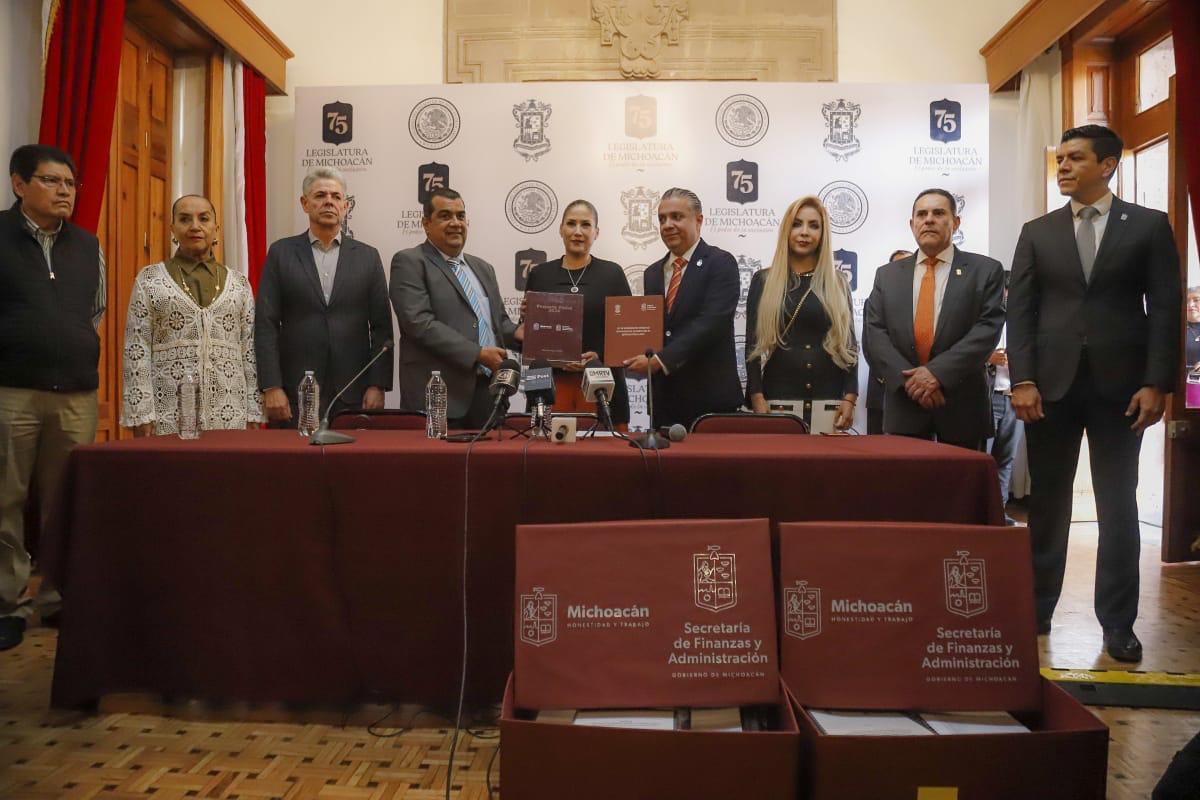 Morelia, Michoacán , a 21 de noviembre del 2023.- Bajo la premisa de analizar y aprobar un techo presupuestal que atienda las prioridades y necesidades reales de la población, la 75 Legislatura de Michoacán recibió, a través de la diputada Laura Ivonne Pantoja Abascal, presidenta de la Mesa Directiva del Congreso, la propuesta económica del Paquete Fiscal 2024, de parte del Ejecutivo del Estado.
