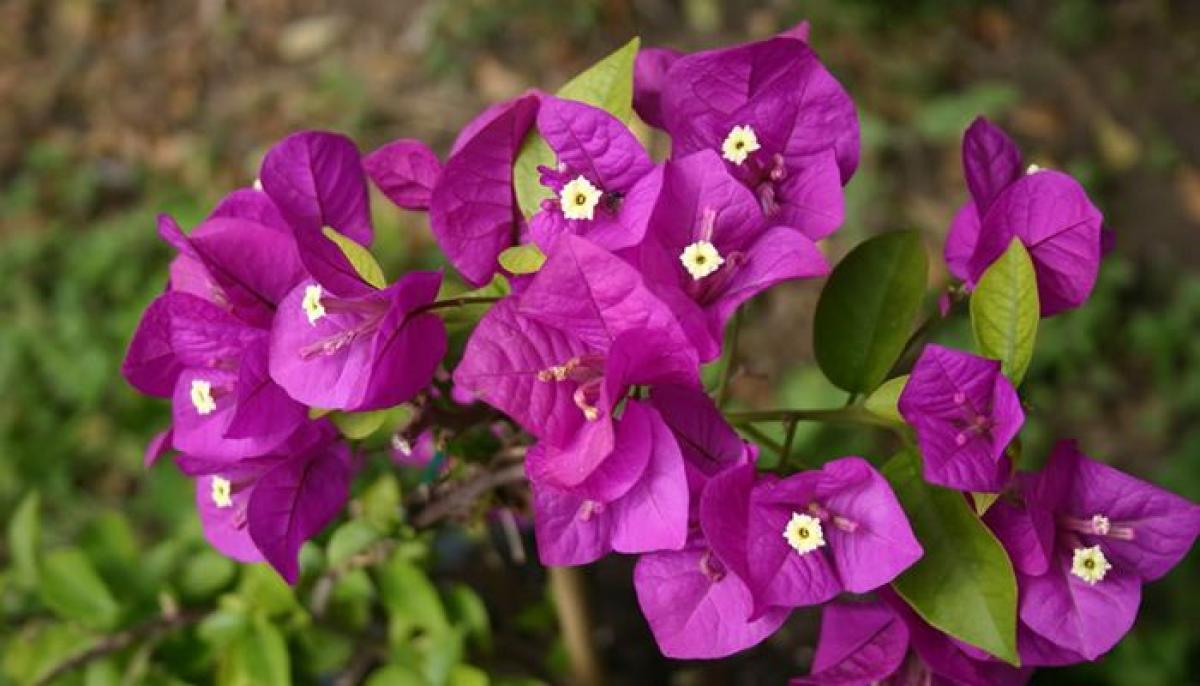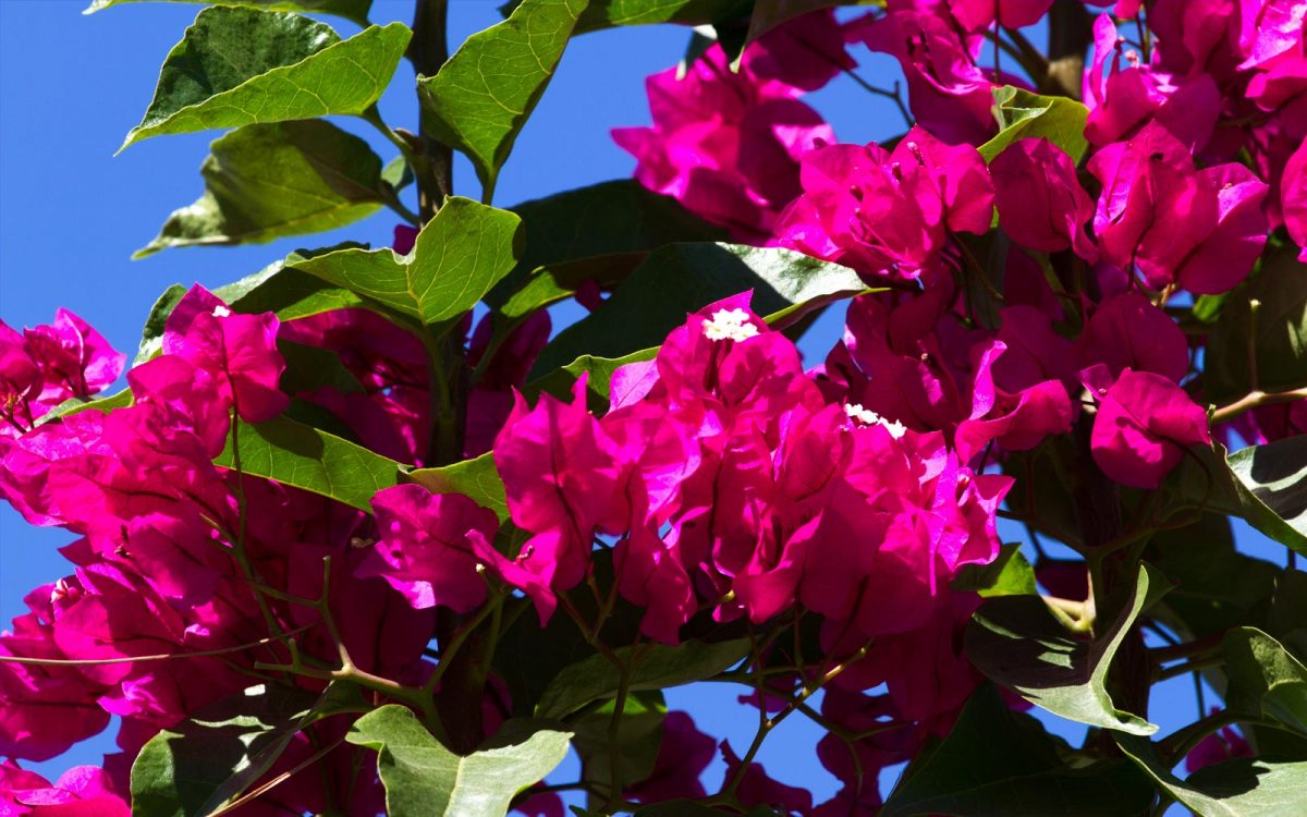 Tiene una espectacular floración que en algunas ocasiones cubre la planta por completo. En climas cálidos florece de primavera a otoño. Las brácteas florales de color rosa, rojo o púrpura se sitúan alrededor de una flor pequeña con la forma de un tubito alargado, recorrido por costillas de color purpúreo o purpúreo-verdoso que se prolongan para terminar en una estrellita de color amarillento. Las inflorescencias aparecen en el último tercio de las largas ramas.